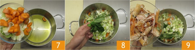 Erhitzen Sie nun in einem Topf mit hohem Rand einen Schuss Öl und rösten Sie das Gemüse 7 einige Minuten bei starker Hitze, fügen Sie die aromatischen Kräuter 8 und die Panzer 9 hinzu,