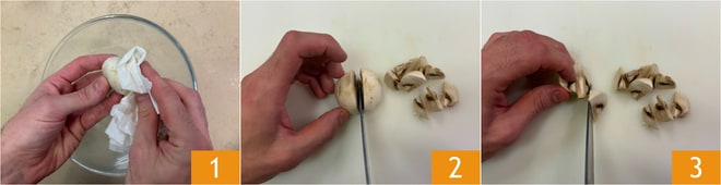 Um die Champignons in der Pfanne zuzubereiten, schneiden Sie zuerst das untere Ende der Stiele ab, das normalerweise sehr erdig ist, und reinigen Sie die Pilzkappen mit einem feuchten Tuch 1. Schneiden Sie sie zunächst in Hälften 2 und dann in Spalten 3. Zur Seite stellen.
