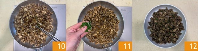Entfernen Sie auch die Petersilienstiele 10, fügen Sie die gehackte frische Petersilie hinzu 11 und richten Sie an. Ihre Champignons in der Pfanne sind bereit zum Servieren 12.