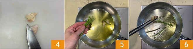 Drücken Sie die Knoblauchzehen in der Schale leicht an 4 und lassen Sie sie in einer Pfanne mit etwas Öl und den Stielen der Petersilie goldbraun werden 5. Entfernen Sie den Knoblauch 6.