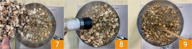 Fügen Sie die Pilze hinzu 7 und lassen Sie sie bei starker Hitze anbraten. Mit Salz 8 und Pfeffer abschmecken. Reduzieren Sie die Hitze und kochen Sie für 10 Minuten, gelegentlich umrühren 9.