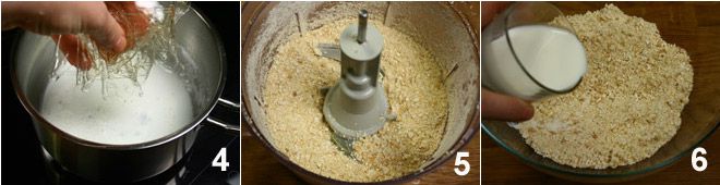 Beginnen Sie die Zubereitung der Charlotte, indem Sie das Nougat zerkleinern (das Sie vorher für mindestens zwei Stunden oder bis es steinhart ist, in den Gefrierschrank gelegt haben), zunächst mit einem Messer 1 und dann mit den Klingen eines Mixers 2. Danach legen Sie die Gelatine in kaltem Wasser ein, bis sie vollständig weich geworden ist 3.