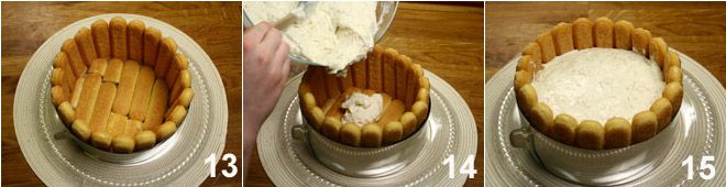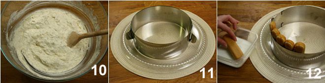 Vermischen Sie alles gut, um die Zutaten zu verbinden 10. Nehmen Sie eine runde Form (am besten eine, die man öffnen kann) mit einem Durchmesser von etwa 22 cm 11, stellen Sie sie auf eine Servierplatte und beginnen Sie damit, die Ränder mit den Löffelbiskuits auszukleiden, die Sie gerade in Milch getaucht haben 12. Die Löffelbiskuits sollten ihre Form behalten: Sie sollten nicht getränkt, sondern nur leicht angefeuchtet sein.
