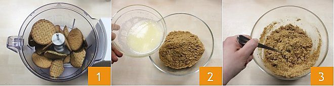 Um den Nougat-Cheesecake vorzubereiten, beginnen Sie mit der Zubereitung des Bodens: Zerkleinern Sie die Kekse in einem Mixer 1, geben Sie sie in eine Schüssel, fügen Sie die geschmolzene Butter hinzu 2 und mischen Sie die Zutaten mit einem Löffel gut durch 3.