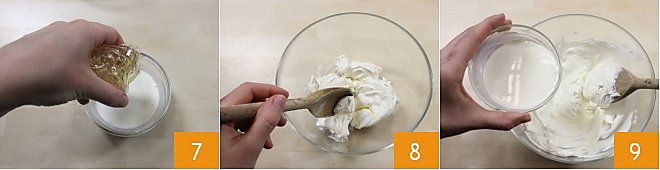Wenn die Gelatine weich geworden ist, drücken Sie sie gut aus und lösen Sie sie in 30 ml heißer Sahne auf, die Sie von der Gesamtmenge genommen haben 7. Weichen Sie den Frischkäse in einer Schüssel mit Hilfe eines Holzlöffels auf 8; bei Bedarf den Frischkäse mit einem Schuss Sahne aus der Gesamtmenge aufweichen. Fügen Sie nun die in Sahne aufgelöste Gelatine hinzu 9 und mischen Sie.