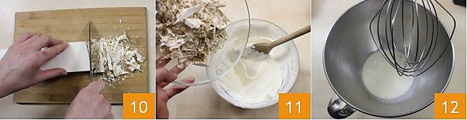 Schneiden Sie den Nougat in Stücke mit einem Messer oder in einem Mixer, den Sie die ganze Nacht im Gefrierfach gelassen haben (lassen Sie einige größere Stücke für die endgültige Dekoration beiseite) 10 und fügen Sie diese auch der Frischkäsecreme hinzu 11; wenn die Creme zu dick ist, geben Sie noch etwas Sahne hinzu. Schlagen Sie mit dem Schneebesen einer Küchenmaschine oder den Quirlen eines elektrischen Handmixers die restlichen ca. 250 ml Sahne mit einem Esslöffel Puderzucker auf 12 (sehen Sie die Kochschule: Sahne aufschlagen) und