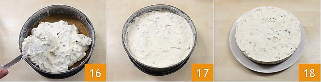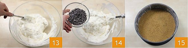 heben Sie diese vorsichtig mit einem Spatel von unten nach oben unter die Creme 13. Zum Schluss fügen Sie die Schokoladentropfen hinzu 14 (fügen Sie sie erst am Ende hinzu, sonst schmelzen sie) und rühren Sie die Creme ein letztes Mal gut durch. Nehmen Sie den Keksboden zurück 15 und