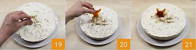 Nach dieser Zeit stürzen Sie Ihren Cheesecake und garnieren Sie ihn mit den beiseitegelegten Nougatstücken 19 und, nach Belieben, mit Karamellverzierungen (sehen Sie, wie man sie mit der Karamell herstellt) direkt in der Mitte des Kuchens 20. Voilà, der Nougat-Cheesecake 21 ist bereit, serviert zu werden!