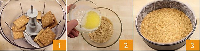 Um den marmorierten Käsekuchen zuzubereiten, beginnen Sie mit der Vorbereitung des Bodens: Geben Sie die Kekse in den Mixer 1 und zerkleinern Sie sie fein. Lassen Sie die Butter in einem kleinen Topf schmelzen; geben Sie die zerkleinerten Kekse in eine Schüssel und fügen Sie nach und nach die geschmolzene Butter hinzu 2, bis alles gut vermischt ist. Fetten Sie eine Springform von 22 cm Durchmesser ein; schneiden Sie einen Kreis Backpapier in der gleichen Größe wie der Boden der Springform zu und zwei Streifen in der gleichen Höhe wie die Ränder, und kleiden Sie die Springform damit aus. Für weitere Details schauen Sie sich das Tutorial Wie man eine Backform mit Backpapier auskleidet in der Kochschule an. Drücken Sie die zerkleinerten Kekse in die mit Backpapier ausgelegte Form und drücken Sie mit einem Löffel die Keksbasis fest 3. Kühlen Sie die Mischung eine halbe Stunde im Kühlschrank oder etwa zehn Minuten im Gefrierfach.
