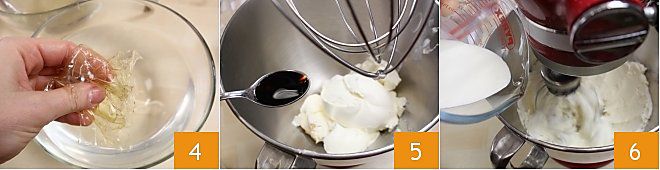 Jetzt widmen Sie sich der Füllung: Bereiten Sie die helle Creme vor, indem Sie 8 g Gelatineblätter in kaltem Wasser einweichen und sie weich werden lassen 4. Schlagen Sie den Frischkäse mit Zucker, Vanille 5 und 100 ml Sahne 6 zu einer glatten und homogenen Masse. Erhitzen Sie zwei Esslöffel Sahne (machen Sie es in der Mikrowelle zur Bequemlichkeit) und lösen Sie darin die zuvor abgetropfte und ausgedrückte Gelatine auf.