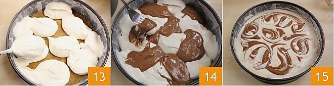 An diesem Punkt können Sie beginnen, Ihren Käsekuchen zusammenzusetzen: Geben Sie die weiße Creme 13 in Abständen auf die mittlerweile kompakten Keksboden, füllen Sie die Lücken mit der dunklen Creme. Um den marmorierten Effekt zu erzielen, verwenden Sie eine Gabel und führen Sie eine Bewegung von unten nach oben aus, um die 2 Massen leicht zu mischen 14. Stellen Sie den marmorierten Käsekuchen für mindestens 4-6 Stunden in den Kühlschrank, bevor Sie ihn servieren 15.