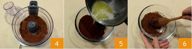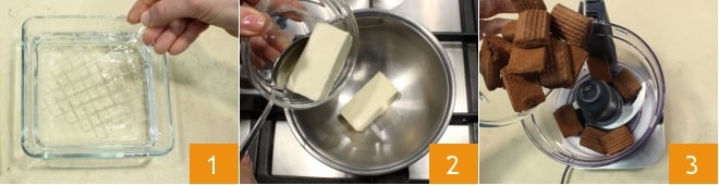 Zerkleinern Sie sie fein 4 und geben Sie sie dann in eine kleine Schüssel und fügen Sie die geschmolzene Butter in einem dünnen Strahl hinzu 5. Mischen Sie die Masse mit einem Holzlöffel 6: Dies wird der Boden des Käsekuchens sein.