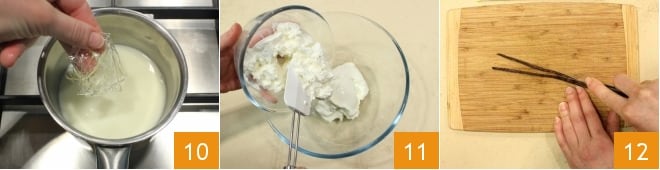 und fügen Sie sie der erwärmten Sahne hinzu 10, rühren Sie, um die Gelatine vollständig aufzulösen. Während die Sahne abkühlt, bereiten Sie die Frischkäsecreme vor: Geben Sie den Frischkäse und die Ricotta in eine Schüssel 11. Schneiden Sie dann eine Vanilleschote auf 12 und kratzen Sie die Samen mit der Messerspitze heraus.