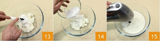Fügen Sie sie den Käsesorten hinzu 13, dann geben Sie die restliche flüssige frische Sahne, den Puderzucker 14 und die Sahne, in der Sie die Gelatineblätter aufgelöst haben, mittlerweile etwas abgekühlt, hinzu. Bearbeiten Sie die Creme mit einem elektrischen Mixer 15.