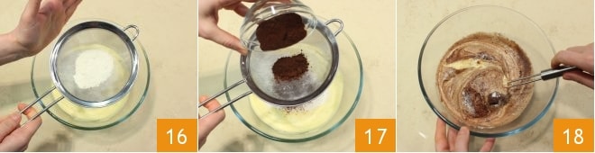 Sieben Sie in die Schüssel die Speisestärke 16, das Mehl und das Backpulver und das Kakaopulver 17 Dann mischen Sie 18, um die Creme homogen zu machen.
