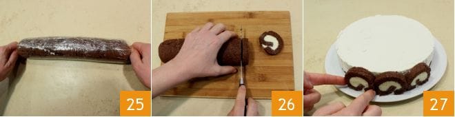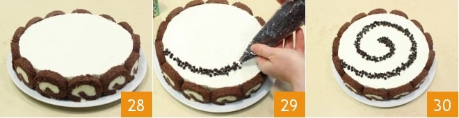 Wenn Sie fertig sind 28, nehmen Sie die Schokoladentropfen zum Dekorieren und geben Sie sie in einen Einweg-Spritzbeutel; schneiden Sie dann die Spitze ziemlich klein ab und lassen Sie ein paar Tropfen auf einmal fallen, um ein Spiralmuster auf der Torte zu erzeugen (29-30): Ihre Käsekuchen Swiss Roll ist bereit, genossen zu werden!