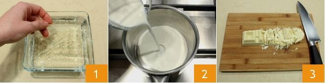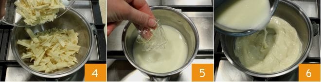 und schmelzen Sie sie im Wasserbad 4. Wenn die Sahne und die Milch heiß sind, gießen und drücken Sie die Gelatineblätter sorgfältig aus und lösen Sie sie darin auf 5, indem Sie mit einem Schneebesen rühren, um Klumpen zu vermeiden. Schalten Sie die Hitze aus und lassen Sie es abkühlen; erst dann können Sie diese Flüssigkeit, in der Sie die Gelatine aufgelöst haben, über die mittlerweile geschmolzene weiße Schokolade gießen 6;