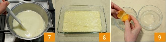 rühren Sie mit einem Holzlöffel, um die beiden Mischungen zu verbinden 7. Gießen Sie die Creme in eine breite und flache Schüssel und bedecken Sie sie mit Frischhaltefolie 8; stellen Sie sie im Kühlschrank für mindestens 2 Stunden fest werden. In der Zwischenzeit widmen Sie sich dem Biskuitteig: Trennen Sie die Eier in Eigelb und Eiweiß 9