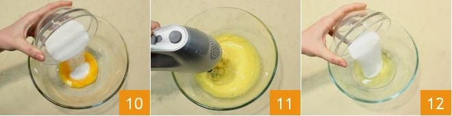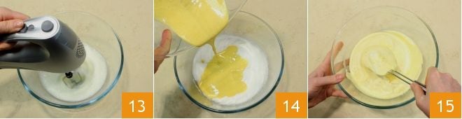 und schlagen Sie sie 13, bis sie cremig sind (achten Sie darauf, die Rührbesen von jeglichen Spuren von Eigelb und Zucker gereinigt zu haben, bevor Sie die Eiweiße bearbeiten). Gießen Sie vorsichtig die Eigelbe über die geschlagenen Eiweiße 14 und mischen Sie die beiden Mischungen mit einer Spachtel mit Bewegungen von oben nach unten, um sie nicht zu entleeren 15.