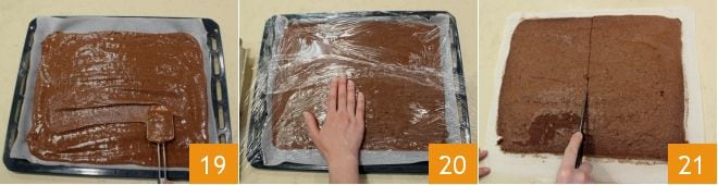 Legen Sie ein Backblech mit Backpapier aus (Sie können das Backblech leicht einfetten, damit das Backpapier besser haftet), verteilen Sie die Masse gleichmäßig auf dem Backblech 19 und backen Sie sie im vorgeheizten statischen Ofen bei 200° für 6-7 Minuten (wenn Umluftofen, bei 180° für 4-5 Minuten). Sobald sie gebacken ist, nehmen Sie sie aus dem Ofen und bedecken Sie sie sofort mit Frischhaltefolie 20, um zu verhindern, dass der Biskuitteig beim Abkühlen an der Oberfläche austrocknet. Während der Biskuitteig abkühlt, nehmen Sie die weiße Schokoladencreme heraus und bearbeiten Sie sie ein paar Momente mit dem Mixer, um sie weicher zu machen. Entfernen Sie dann die Folie vom mittlerweile kalten Biskuitteig, schneiden Sie ihn in zwei Rechtecke 21