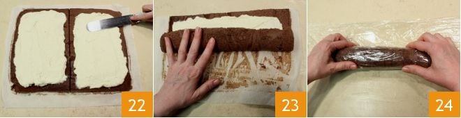 und füllen Sie beide mit der Creme, indem Sie sich mit einer Spachtel 22 oder dem Rücken eines Löffels helfen. Rollen Sie beide Rechtecke von einer der längeren Seiten aus auf 23 und drücken Sie sie gut mit den Händen zusammen. Wickeln Sie jede Rolle in Frischhaltefolie 24