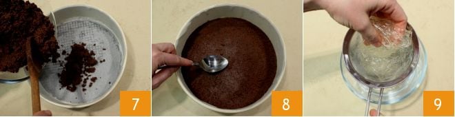 Geben Sie die Masse in eine mit Backpapier ausgelegte Springform von 22 cm Durchmesser 7 und verteilen Sie sie gleichmäßig am Boden, indem Sie sie mit dem Rücken eines Löffels andrücken 8. Sie können den Boden für mindestens eine halbe Stunde im Kühlschrank festwerden lassen. In der Zwischenzeit widmen Sie sich der Füllung: Erhitzen Sie 50 ml Sahne in einem kleinen Topf; dann gießen und drücken Sie die Blattgelatine sorgfältig aus 9