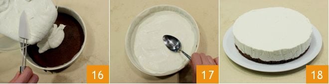 Gießen Sie die Creme auf den mittlerweile festen Keksboden 16, verteilen Sie sie gleichmäßig mit dem Rücken eines Löffels 17 und stellen Sie den Käsekuchen im Kühlschrank abgedeckt mit Alufolie für mindestens 2 Stunden kalt. Sobald er fest ist, ist Ihr Käsekuchen bereit 18 dekoriert zu werden.