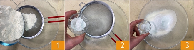 Um die Chiffon Cake mit Orange und Schokolade vorzubereiten, siebe zuerst das Weizenmehl (Tipo 00) in eine große Schüssel 1 – ein grundlegender Schritt, um eine luftige Konsistenz zu erreichen. Siebe dann auch das Backpulver 2 und füge eine Prise Salz hinzu 3.