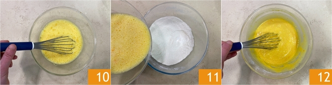 Verrühre alles mit einem Schneebesen, bis eine gut verbundene Masse entsteht 10. Gieße dann die flüssige Mischung in die Schüssel mit den trockenen Zutaten 10 und rühre weiterhin mit dem Schneebesen, bis ein glatter, homogener Teig ohne Klumpen entsteht 12.