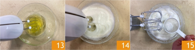 In einer anderen, absolut sauberen Schüssel beginne, das Eiweiß mit dem Handmixer aufzuschlagen 13. Wenn es fast steif ist 14, siebe den Cremor Tartar direkt in die Schüssel 15.