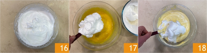 Schlage mit dem Handmixer weiter, bis das Eiweiß vollständig steif ist 16. Nimm einen ersten Teil des geschlagenen Eiweißes und hebe ihn in den Teig unter 17. Hebe vorsichtig mit einem Teigspatel (Gummispatel) von unten nach oben, damit die Masse nicht zusammenfällt. Gib dann nach und nach das restliche Eiweiß dazu und arbeite es ebenso behutsam unter 18.
