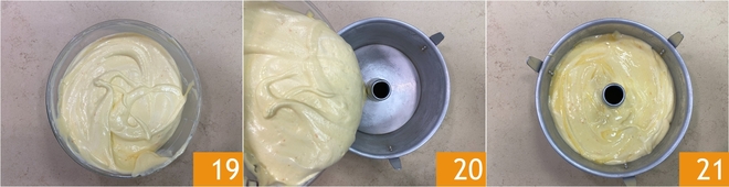 So erhältst du einen luftigen und gut verbundenen Teig 19. Nun bereite die Chiffon-Kuchen-Form vor – sie darf nicht eingefettet werden: dieser Teig muss an den Formwänden „haften“, damit er beim Backen korrekt aufgehen kann. Fülle den Teig in die Form 20, gleite ihn sehr vorsichtig glatt, ohne die Form zu stoßen 21, und stelle sie auf den untersten Einschub des Ofens. Backe im vorgeheizten Ober-/Unterhitzeofen bei 160°C für etwa 55 Minuten.