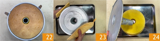 Nach Ablauf der angegebenen Zeit mache die Stäbchenprobe. Ist der Kuchen fertig, nimm die Chiffon Cake aus dem Ofen 22 und stürze die Form sofort auf ein Backblech – dank der speziellen Füßchen bleibt sie erhöht stehen 23. Lass das Gebäck in dieser Position vollständig abkühlen: dieser Schritt ist entscheidend, damit der Kuchen nicht zusammenfällt und seine typische hohe, luftige Struktur behält. Wenn der Kuchen vollständig erkaltet ist, löse die Form vorsichtig, indem du zuerst den Boden entfernst 24, und setze den Kuchen auf eine Servierplatte.
