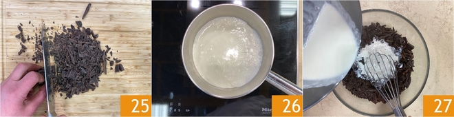 In der Zwischenzeit bereite die Schokoladenglasur zu: Hacke die Zartbitterschokolade fein 25 und gib sie in eine Schüssel. Erhitze die Sahne in einem Topf und bringe sie fast zum Kochen 26. Gieße dann die heiße Sahne über die gehackte Schokolade 27.