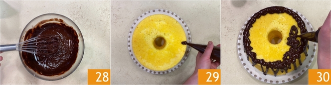 Rühre mit einem Schneebesen, bis eine glatte, glänzende Creme entsteht und die Schokolade vollständig geschmolzen ist 28. Lass die Glasur etwas abkühlen, bis sie leicht dickflüssiger wird. Verteile die Glasur dann, indem du sie zuerst an den Seiten herunterlaufen lässt 29 und anschließend die Oberfläche der Chiffon Cake bedeckst 30. Zur Erleichterung kannst du einen Spritzbeutel verwenden.