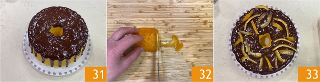 Wenn die Chiffon gut mit Glasur überzogen ist 31, schneide die kandierte Orange in Streifen 32 und verwende sie zur Dekoration des Kuchens 33. Deine Chiffon Cake mit Orange und Schokolade ist servierbereit!