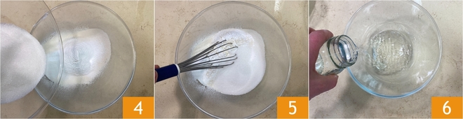 Gib dann den Kristallzucker hinzu 4 und vermische alle trockenen Zutaten mit einem Schneebesen gut, damit sie gleichmäßig verteilt sind. Jetzt widme dich den flüssigen Zutaten: Nimm eine zweite Schüssel und gib das Wasser bei Raumtemperatur hinein 6.