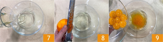 Füge das Pflanzenöl hinzu 7. Aromatisiere mit der abgeriebenen Schale einer Orange 8 und gib zuletzt die Eigelbe dazu 9.