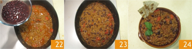 Nach dieser Zeit die Bohnen mit etwa 470 g ihrer Konservierungsflüssigkeit hinzufügen 22 und weitere 40 Minuten bei mittlerer bis niedriger Hitze köcheln lassen. Sobald es fertig ist, den Topf vom Herd nehmen und etwa zehn Minuten ruhen lassen 23. Mit ein paar Korianderblättchen garnieren und das Chili con Carne heiß servieren 24!
