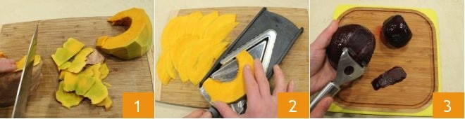 Um die Gemüsechips zuzubereiten, beginnen Sie damit, den Kürbis in Spalten zu schneiden, entfernen Sie dann die Schale mit einem Messer 1 und schneiden Sie ihn mit einer Mandoline fein 2. Schälen Sie die Rote Bete 3