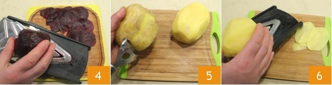 und schneiden Sie sie ebenfalls mit der Mandoline in dünne Scheiben 4. Schälen Sie zuletzt die Kartoffeln 5 und verfahren Sie wie bei den anderen Gemüsesorten: Schneiden Sie sie mit der Mandoline in recht dünne Scheiben 6.