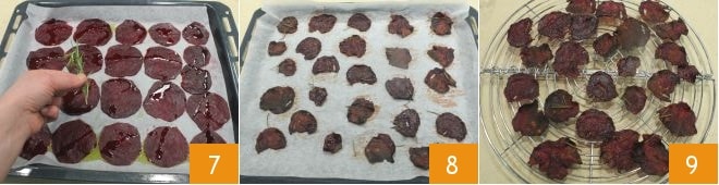 Belegen Sie ein Backblech mit Backpapier, legen Sie die Rote Bete Scheiben darauf, beträufeln Sie diese mit etwas Olivenöl, salzen Sie und würzen Sie mit ein paar Rosmarinzweigen 7. Backen Sie die Rote Bete Chips im Umluftofen bei 220 °C für 20 Minuten oder so lange, bis sie trocken sind (im statischen Ofen bei 230 °C für 40 Minuten). Nach dem Backen nehmen Sie die Chips heraus 8 und legen sie auf ein Gitter, um sie abkühlen zu lassen 9.