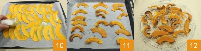 Machen Sie nun mit dem Kürbis weiter: Verteilen Sie die Kürbisscheiben auf einem mit Backpapier ausgelegten Backblech, würzen Sie sie mit Olivenöl, Salz und Rosmarin 10, backen Sie die Kürbischips im Umluftofen bei 220 °C für 10 Minuten (im statischen Ofen bei 230 °C für 40 Minuten). Sobald sie knusprig sind, nehmen Sie sie heraus 11, legen sie auf ein Gitter und lassen sie dort, bis sie kalt sind 12.