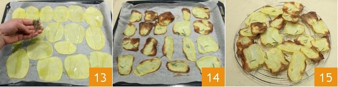 Zum Schluss verfahren Sie genauso mit den Kartoffeln: Legen Sie die Kartoffelscheiben auf das mit Backpapier ausgelegte Blech 13, backen Sie die Kartoffelchips bei gleicher Temperatur im Umluftofen bei 220 °C für 10 Minuten (im statischen Ofen bei 230 °C für 15 Minuten), nach dem Backen sollten die Kartoffeln goldbraun und knusprig sein, nehmen Sie sie heraus 14 und lassen sie auf dem Gitter abkühlen 15.