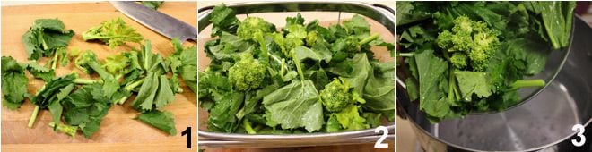 Um Rübstiel mit Wurst zuzubereiten, beginnen Sie mit der Reinigung des Gemüses: Waschen Sie den Rübstiel gründlich, entfernen Sie die härteren Stiele und die beschädigten Blätter, schneiden Sie die Blätter in Stücke und lassen Sie die kleinen Köpfe ganz (1-2). Blanchieren Sie sie für 5 Minuten in kochendem Salzwasser 3 und lassen Sie sie gut abtropfen.