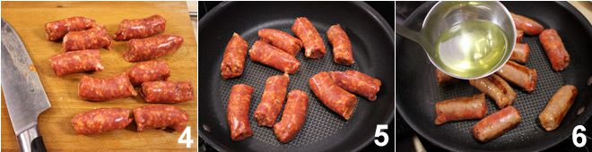 Schneiden Sie inzwischen die Wurst in kleine Stücke 4 und lassen Sie sie in einer beschichteten Pfanne anbraten 5, fügen Sie nach ein paar Minuten ein paar Esslöffel des Kochwassers vom Rübstiel hinzu 6.