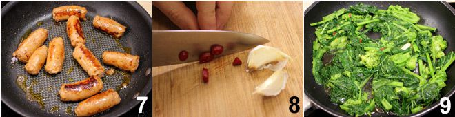 Garen Sie die Würste 7. Schälen Sie den Knoblauch und schneiden Sie die Chili in Scheiben 8. In einer Pfanne das Olivenöl extra vergine erhitzen, die halbierte Knoblauchzehe und die in Scheiben geschnittene Chili hinzufügen. Den Knoblauch goldbraun werden lassen und dann den gekochten Rübstiel hinzufügen, den Sie für einige Minuten sautieren 9, schließlich salzen.