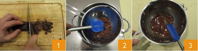 Um die dunklen Schokoladenpralinen mit Mascarponecreme herzustellen, beginnen Sie damit, die Zartbitterschokolade mit einem Messer zu hacken 1, erhitzen Sie die Schokolade im Wasserbad 2, bis sie vollständig geschmolzen ist 3.
