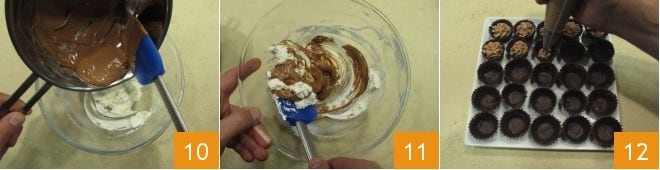 Gießen Sie die geschmolzene Milchschokolade in die Schüssel mit dem Mascarpone 10, rühren Sie weiter, bis eine homogene Creme entsteht 11. Übertragen Sie die Creme in einen Spritzbeutel mit Sterntülle und lassen Sie sie im Kühlschrank etwa 1 Stunde fest werden. Nehmen Sie nach dieser Zeit sowohl die Schokoladenkörbchen als auch die Creme, spritzen Sie einen Klecks Creme auf jede Praline 12. Sobald alle Pralinen gefüllt sind, garnieren Sie die Hälfte mit Haselnusskrokant und die andere Hälfte mit Pistazienkrokant.