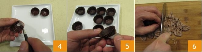 Bestreichen Sie nun die Innenseite einschließlich der Ränder der kleinen Förmchen 4. Stellen Sie sie auf ein Tablett und lassen Sie sie 1 Stunde im Kühlschrank aushärten. Nehmen Sie nach dieser Zeit die Förmchen wieder heraus, stellen Sie sicher, dass die Schokolade fest ist und entnehmen Sie sie dann vorsichtig aus den Förmchen 5. In der Zwischenzeit kümmern Sie sich um die Creme: hacken Sie auch die Milchschokolade 6,